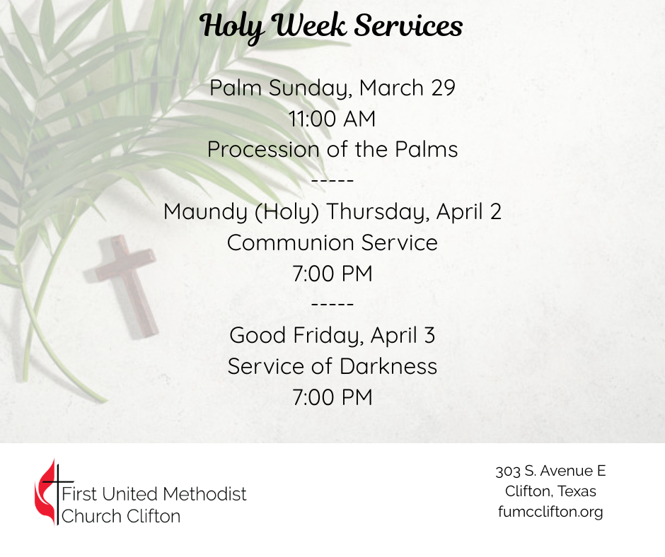 From the Lord’s Supper with His disciples, to His betrayal and crucifixion, to His burial and glorious resurrection, Holy Week invites us to walk step by step through the heart of our faith. We hope you will plan to join us as we remember, reflect, and rejoice together.