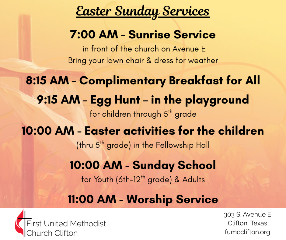 Egg Hunt and Easter Palooza activities for kids thru the 5th grade will be held in the turf covered playground at 9:15am. The Palooza will be in the Fellowship Hall afterwards.